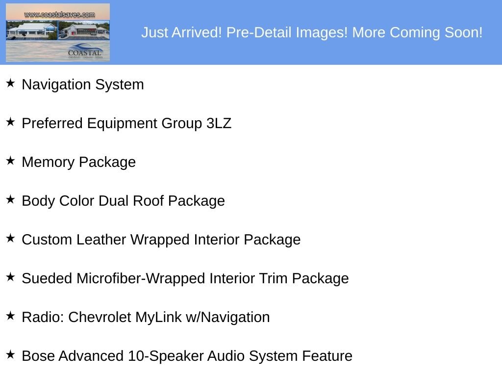 1-Piece Removable Transparent Roof Panel, 3LZ Interior Trim, 8-Way Driver & Passenger Seat Adjusters, AM/FM radio: SiriusXM, Apple CarPlay, Auto headlights, Auto temperature control, Auto-Dimming Inside Frameless Rearview Mirror, BackUp Camera, Body Color Dual Roof Package, Body-Color Outside Heated Power-Adjustable Mirrors, Bose Advanced 10-Speaker Audio System Feature, Cargo Net, Custom Leather Wrapped Interior Package, Front Curb View Cameras, Head-Up Display, Heated & Vented Driver & Passenger Seats, Luggage Shade, Memory Package, Navigation System, Painted Body-Color Carbon Fiber Removable Roof Panel, Performance Data & Video Recorder, Power driver seat, Power Lumbar/Bolster Seat Adjusters, Power passenger seat, Preferred Equipment Group 3LZ, Radio: Chevrolet MyLink w/Navigation, Remote Start, Sueded Microfiber-Wrapped Interior Trim Package, Theft Deterrent System, Universal Home Remote, Wheels: 19" x 10" Fr & 20" x 12" Rr Z06 Chrome Alum.