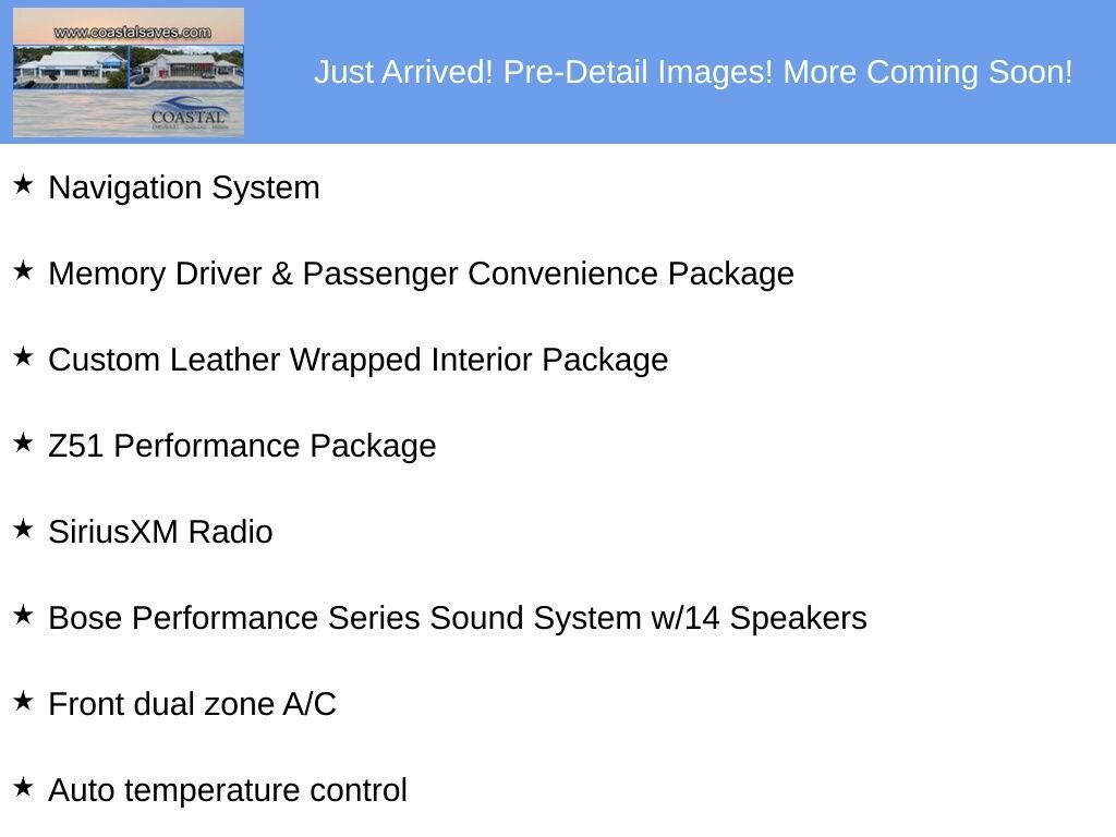 Apple CarPlay/Android Auto, Auto headlights, Auto temperature control, Body-Color Removable Roof Panel, Bose Performance Series Sound System w/14 Speakers, Custom Leather Wrapped Interior Package, Electronic Limited-Slip Differential, Front dual zone A/C, Head-Up Display, Heated front seats, Heated Steering Wheel, Heavy-Duty Cooling System, Memory Driver & Passenger Convenience Package, Memory seat, Navigation System, Performance Exhaust w/Stainless-Steel Tips, Performance Rear Axle Ratio, Power Driver Seat, Power Passenger Seat, Power passenger seat, Rear Camera Mirror., Rear Cross Traffic Alert, Rear Z51 Spoiler, Side Blind Zone Alert, SiriusXM Radio, Ventilated front seats, Visible Carbon Fiber Removable Roof Panel, Wheels: 19" x 8.5" Fr/20" x 11" Rr Gloss Black, Z51 Performance Brakes, Z51 Performance Package, Z51 Performance Suspension.