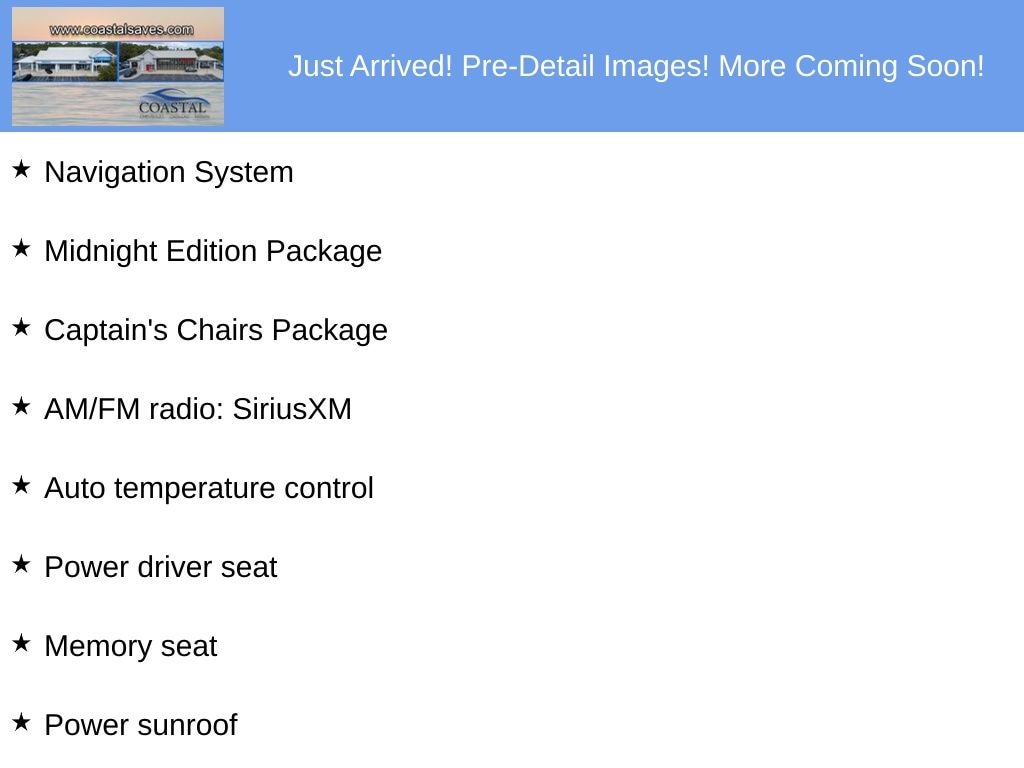 20" x 8J Aluminum Alloy Wheels, 2nd Row Captain's Chairs, 2nd Row Center Console w/Padded Armrest, 3rd row seats, AM/FM radio: SiriusXM, Auto headlights, Auto temperature control, Auto-Dimming Exterior Mirror w/LED Turn Signals, BackUp Camera, Black Painted Grille, Black Painted Roof Rails, Captain's Chairs Package, Cargo Mat & Midnight Edition Floor Mats, Fog Lights, Front & Rear Lower Center Bumper Fascias, Heated front seats, Heated steering wheel, Leather Seats, Memory seat, Midnight Edition Package, Navigation System, Power driver seat, Power Liftgate, Power passenger seat, Power sunroof, Rear LED Lamps w/Black Paint Finisher.