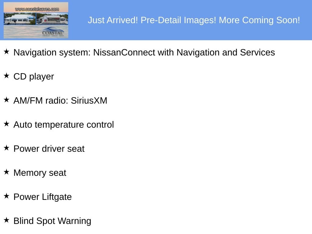CVT with Xtronic, AM/FM radio: SiriusXM, Apple CarPlay and Android Auto, Auto headlights, Auto temperature control, BackUp Camera, Blind Spot Warning, CD player, Fog Lights, Heated & Ventilated Front Bucket Seats, Heated steering wheel, Memory seat, Navigation system: NissanConnect with Navigation and Services, Power driver seat, Power Liftgate.